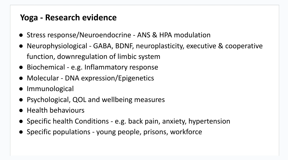 Fortunately, yoga research has been booming, particularly in the past decade, with studies covering a wide range of areas, from measuring cellular and biochemical changes to studying the impact of yoga on stress, sleep, quality of life, immune function, and gene expression. I’ve compiled a list illustrating a few areas where yoga research has been conducted, some of which I hope to impress upon my audience and demonstrate the exciting breadth of this field.
